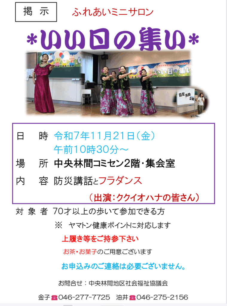 11月21日(金)に中央林間コミセンにて開かれる、”いい日の集い”では、防災講和とククイオハナの皆さんによるフラダンスです。防災の備えを学びつつ、皆さんもフラダンスで気分をリフレッシュしましょう。