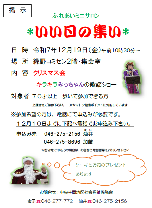 2025年最後の”いい日の集い”は、恒例のキラキラみっちゃんの歌謡ショウです。ケーキとお花のプレゼントもありますので、お楽しみにしてください。