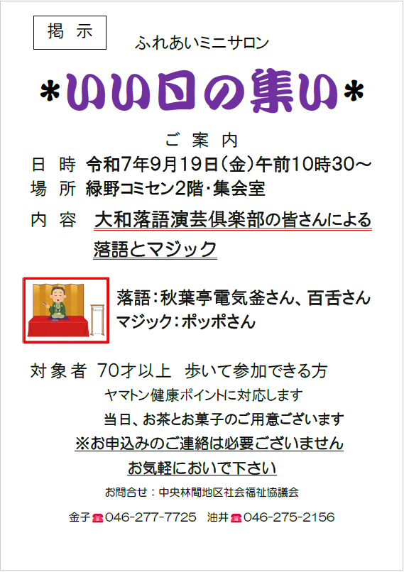 9月19日に緑野コミセンで開かれた”いい日の集い”では、おなじみの大和落語演芸倶楽部のみなさんによる落語とマジックで大いに盛り上がりました。