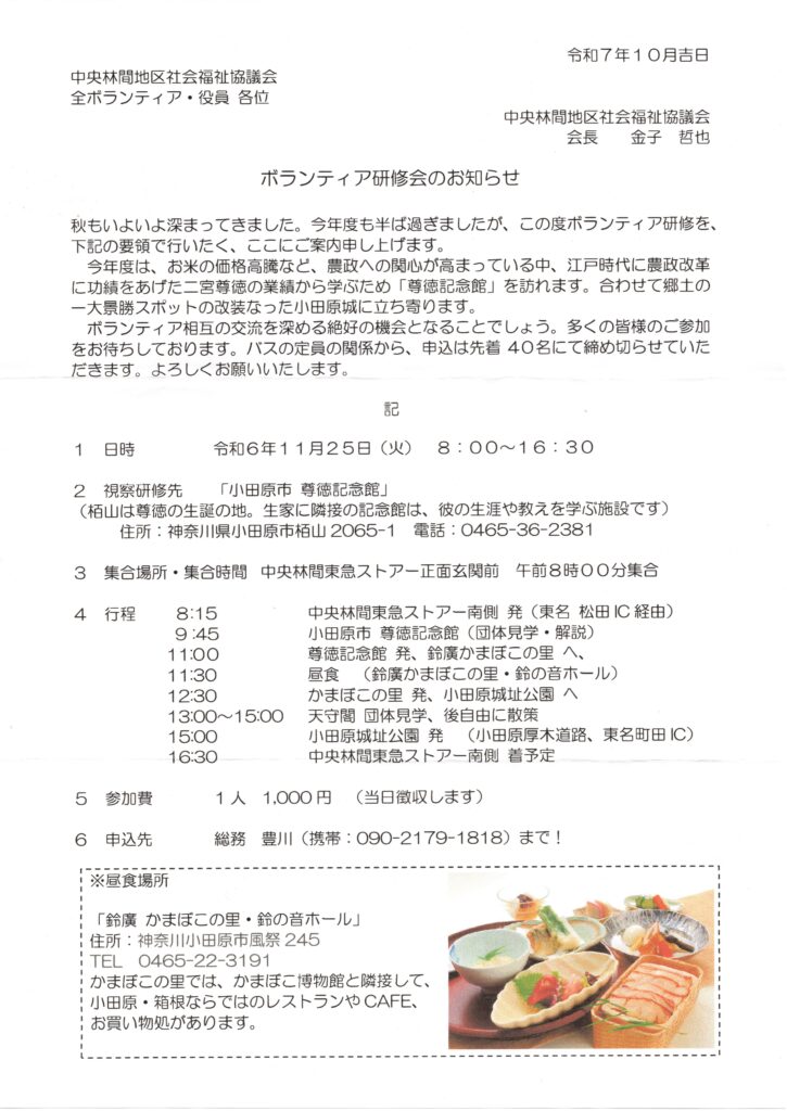 2025年度は、小田原市栢山(かやま)にある”尊徳記念館”を訪ね、その業績を改めて学び、さらに鈴廣かまぼこの里や小田原城などを訪れる予定です。知識を広めるとともに、ボランティア同士の交流も深めて有意義な研修会とできればと思いますので、皆様のご参加をお待ちしています。